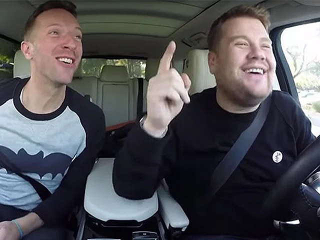Out for a drive, James Corden spots Chris Martin looking for a ride to San Francisco to perform with Coldplay in the Super Bowl 50 halftime show.